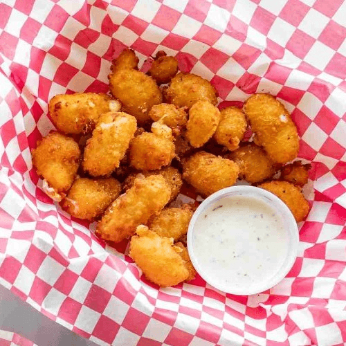 Wisconsin cheese curds. Smaller version of cheese sticks.