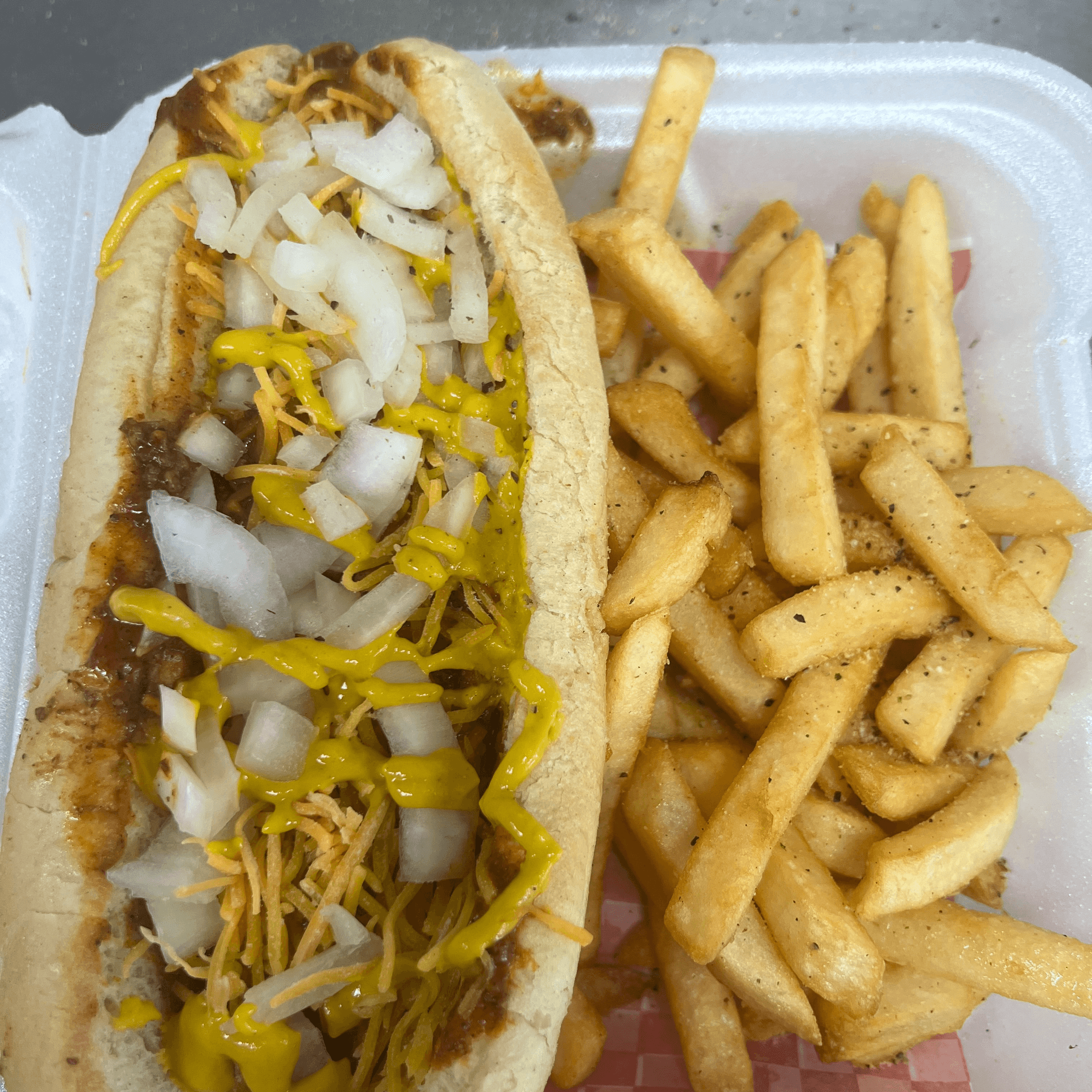 1/4lb All-beef hot dog grilled to perfection on a hoagie with chili, cheese, and onions, served with Mayo, Mustard, and Relish on the side.With the side of fries