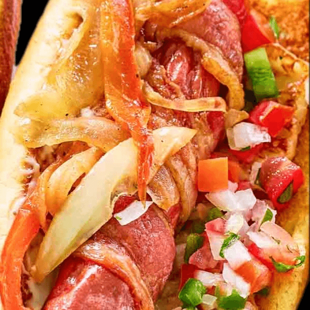 1/4lb All-beef hot dog grilled to perfection on a hoagie with grilled onions, bell pepper, bacon, pico de gallo, served with Mayo, Mustard, and Relish on the side. With the side of fries