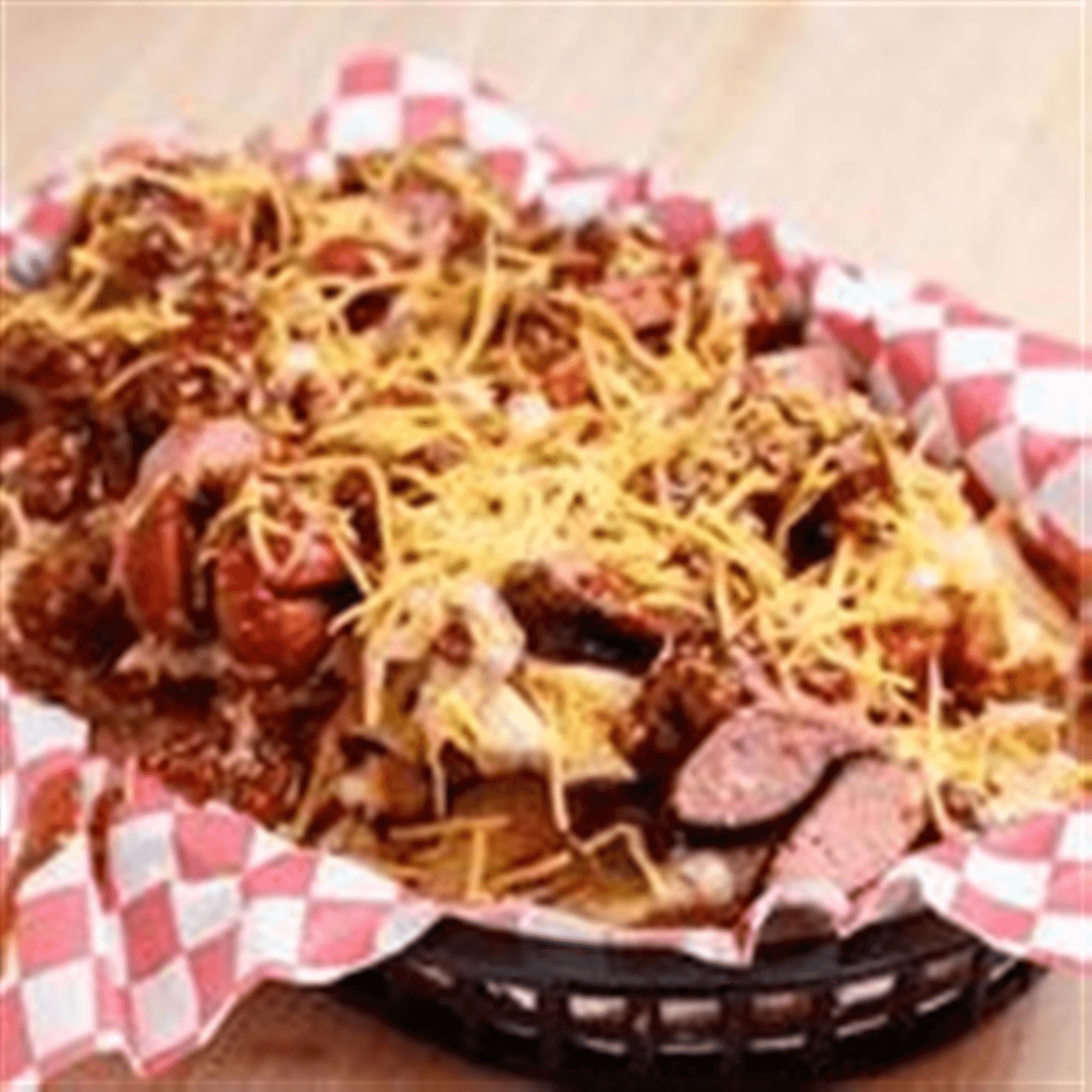 Our seasoned fries with chopped all-beef hot dog, grilled onions, topped with all-beef chili, and shredded cheddar cheese with our special sauce.